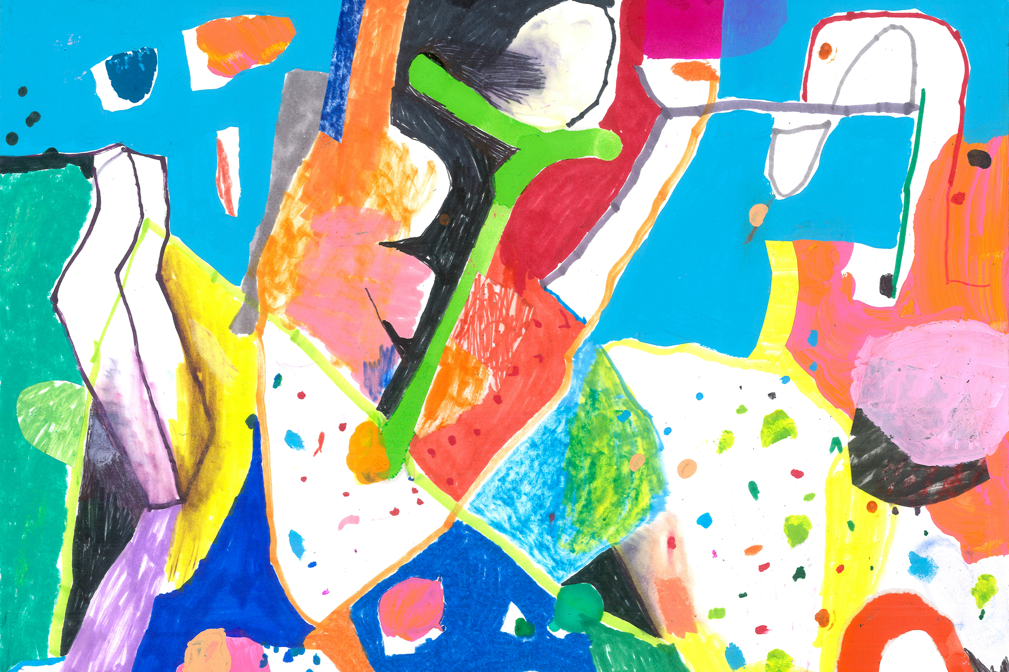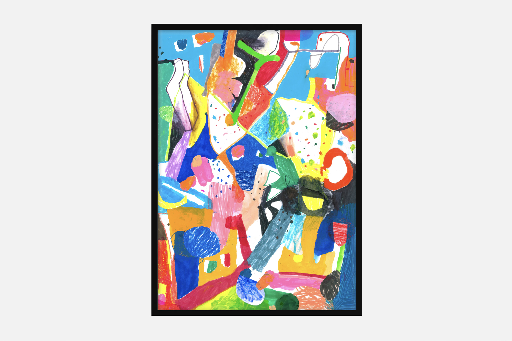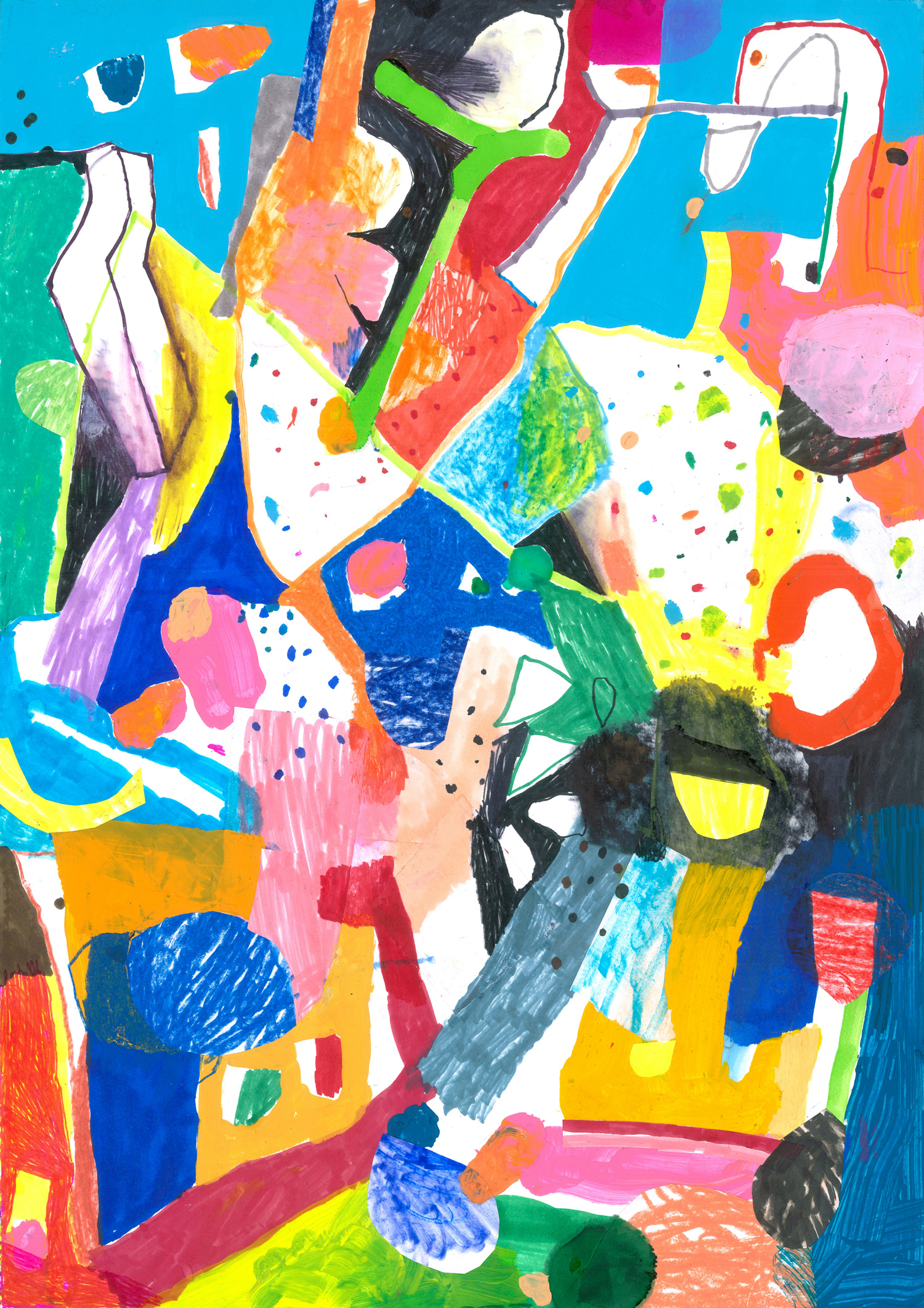 Exactly as in music, a natural rhythm of reading can be created in the color spread. A dynamism that leads the eye to wander among spots, marks and contrasts. Made with mixed technique: acrylic, wall paint, markers on carton bois.